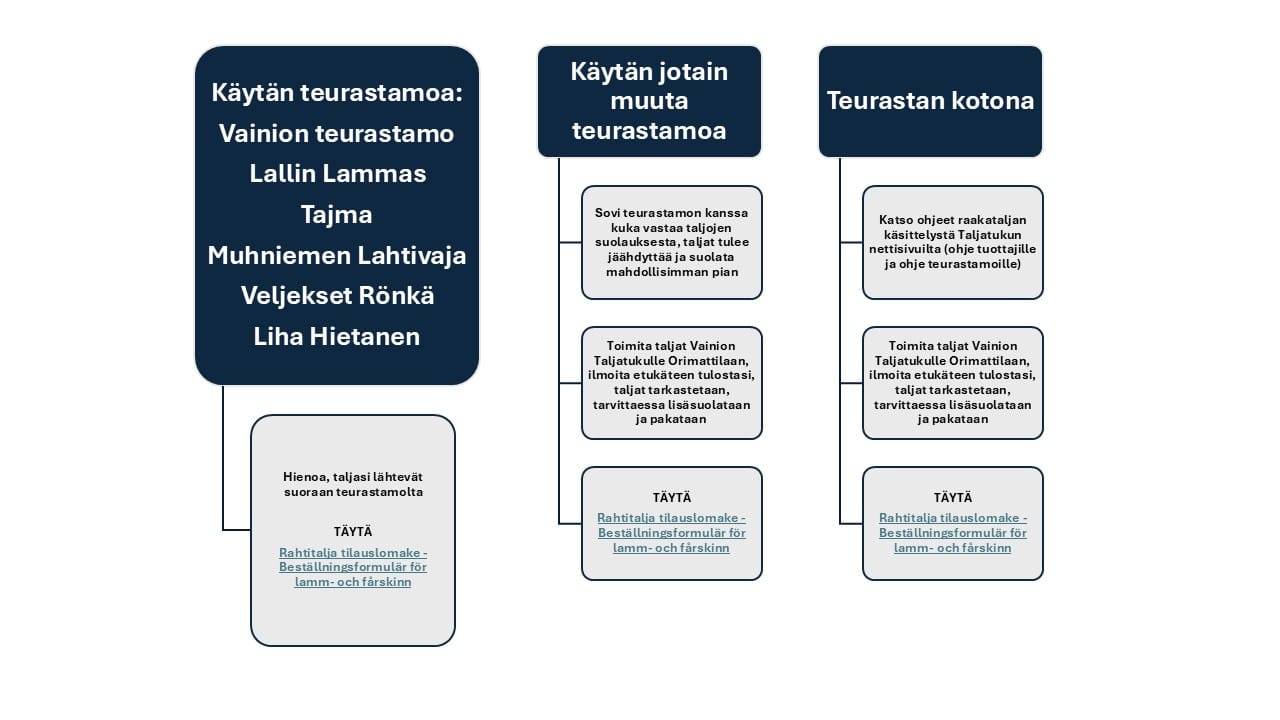 Yhteistyössä Vainion kanssa toimivat teurastamot Lallin Lammas, Ab Tajma, Muhniemen Lahtivaja, Veljekset Rönkä ja Liha Hietanen. Näiden teurastamoiden kautta taljat toimitetaan suoraan kauttamme muokkaamoon.